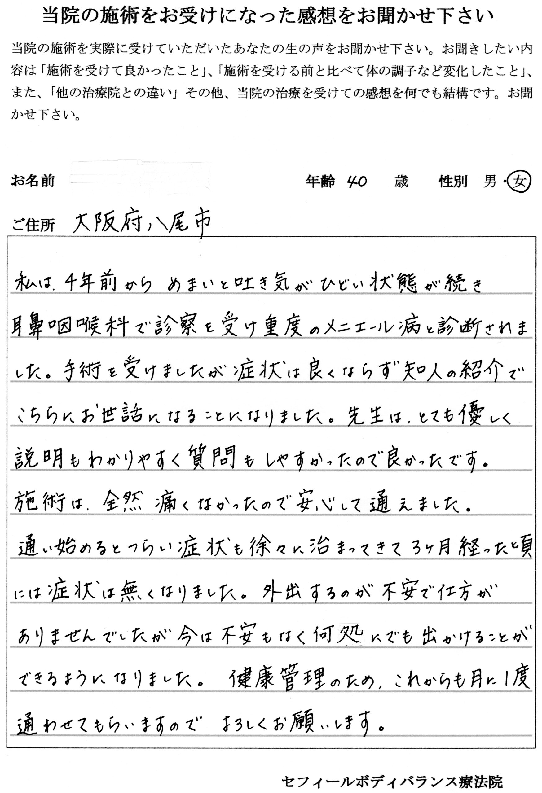 大阪府八尾市 40歳 女性 めまい・吐き気