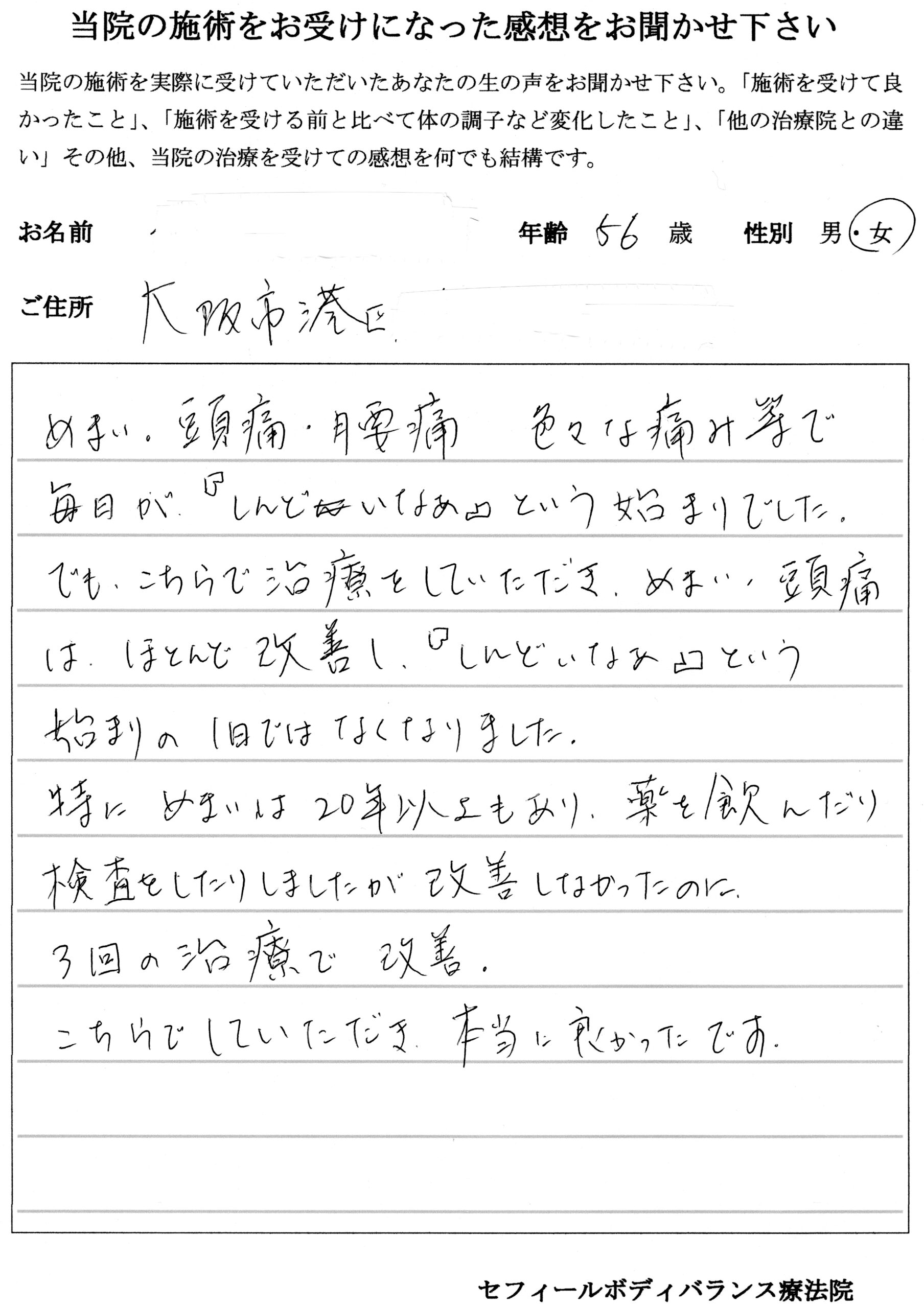 大阪市港区 56歳 女性 めまい・頭痛・腰痛