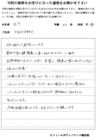 大阪市平野区 43歳 女性 めまい・耳鳴り・頭痛